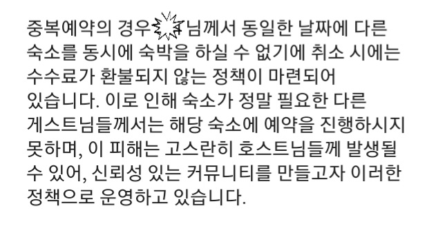 >>>그렇다면 내가 두 번째 숙소를 예약할 때 워닝 알람이 떴어야 하는 거 아닌가? 날짜가 겹치니 서비스 수수료 환불이 안될 수 있다. 라고.